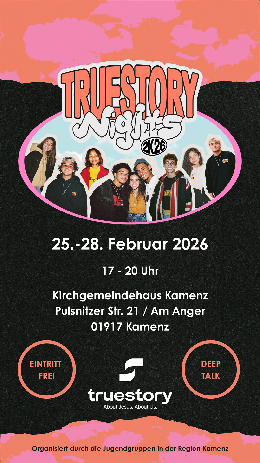 Vom 25. bis 28. Februar 2026, jeweils 17–20 Uhr, laden wir Jugendliche aus Kamenz und Umgebung zu truestory26 ins Kirchgemeindehaus Kamenz ein.